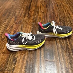 Dynamic Hoka shoes with a black uppers, white and yellow base, and vibrant multicolor accents. Designed for comfort and performance. Worn just a couple times, fit true to size.