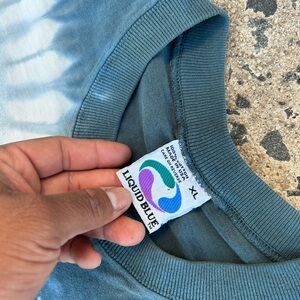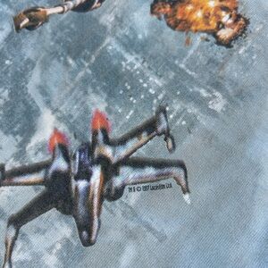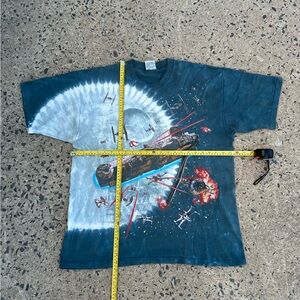 The product is a rare vintage 1997 Star Wars Liquid Blue tee in men's XL size featuring a Millennium Falcon and Death Star design. The shirt is a solid multicolor tie-dye pattern made of cotton material with a crew neck and short sleeves. It is a regular fit shirt with a graphic print on both sides, perfect for fans of Star Wars and 90s nostalgia. Made in the United States, this unique tee is a must-have for any collector or enthusiast of the iconic franchise.