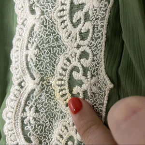 CANDIE’S Lace Embroidered Blouse Top Gathered Long Sleeve Size Large • size large • green sheer top with long fathered sleeve, v neck and lace detail from neckline to bottom hem. Approx measurements: 20” pit to pit, length 24.5” • please note flaws — at base of v neck, there is some loose threading. There is also a stain spot that may be able to be removed with additional launder / spot treatment. • tag for size, material description and / or care instructions is not present / has been cut out. 🏷✨ OFFERS WELCOME 🚛💨 QUICK SHIP OUT! 🚭🏠SMOKE-FREE HOME D4 Tags: boho, bohemian, Staple, Layer, Layered, Transitional, Gypsy, Distressed, Fringe, Sparkle, Wedding, Graduation, Bridal Shower, Dinner, Vacation, Festival, Party, Holiday, Date Night, Slouchy, Oversized, Fuzzy, Distressed, Chic, Vintage, Career, Office, Grunge ,Cozy, everyday, classy, Chunky, Boho, basic, classic, staple, layer, layered, transitional, dinner, vacation, date night, party, holiday, oversized, career, office, comfy, colorful, kawaii, loose fit, modest, relaxed fit, date night, grannycore, workwear, knit, trendy