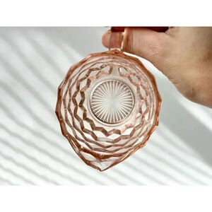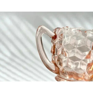 Lovely set of 2 matching coffee | creamer | tea cups. The design is sort of cubed / optic. Both have handles and spouts for an easy pour. I'd probably use these are creamer and sugar cups. Such a cute pair. I have lots of other depression glass in my shop, just keyword search for it.