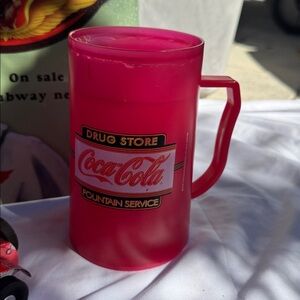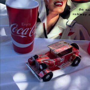 Awesome Coca-Cola collector set. Comes with a metal sign, 2 cups and a Handcrafted car made from a Coca-Cola can. Vibrant red design with intricate details.