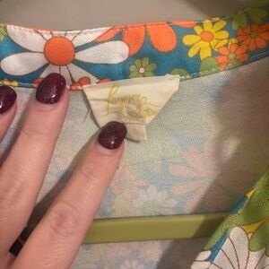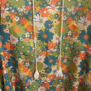 Selling this adorable 'Mod' 70's style long sleeve floral dress. Bright yellow, orange, green and turquoise. In good used condition - tassels are a bit frayed (see pic). Size small but I feel like fits more like a medium. Purchased from a boutique - brand on tag is 'Layerz'