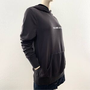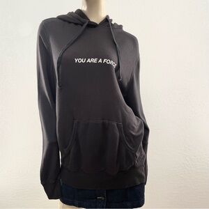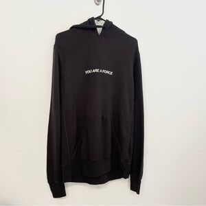 Black hoodie with 'You Are A Force' text. Features vibrant graphic on back. Cozy and stylish. Oversized fit.