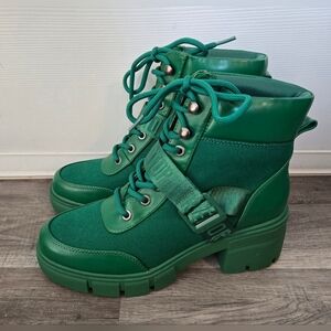 Redtop Brand Green Chunky Lug Sole Combat Boots, Ankle Boots, Mixed Texture Design, Lace up with Strap across closure, Women's Size 6.5, New Without Tags
