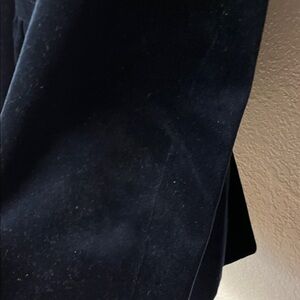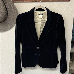 Sophisticated navy velvet blazer. Tailored fit with button closure, fully lined, fun lime green lining in the arms, two side pockets, feminine pleating details. Came from my personal closet. One owner. Good pre-owned condition. Light wear on elbow areas (see picture).