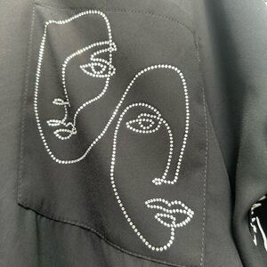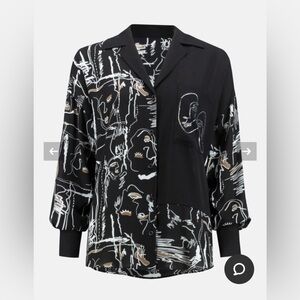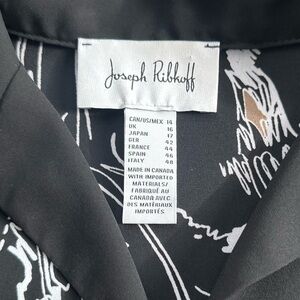 Elevate your look with this striking abstract face-print blouse. JOSEPH RIBKOFF Crafted from lightweight fabric 70% Polyester, 30% Polyester that combines modern artistry with timeless elegance. The design features a relaxed fit, button-down front, and mixed-panel pattern in black and neutral tones. Perfect for both work and weekend wear, this blouse pairs effortlessly with tailored pants or denim for a chic, contemporary finish.