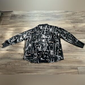 black shirt with white abstract print. Elegant design by Joseph Ribkoff.