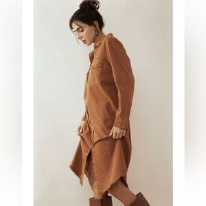 “This button-down shirt dress has an understated dynamic with its soft fabric and beautiful sandstone-inspired color. It features full-length sleeves, two front pockets, and a frayed edge hem.”