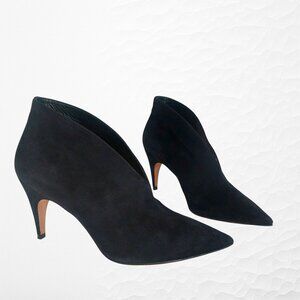 Keywords: designer booties, Italian handmade, Derek Lam, black suede heels, pointed toe, luxury shoes, minimalist, modern, elegant, workwear, party heels, evening shoes,