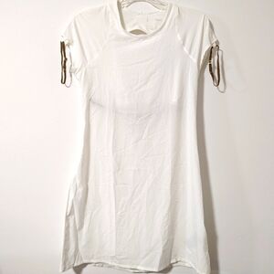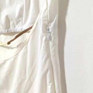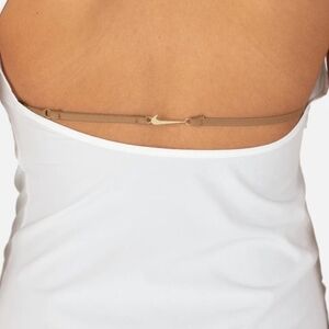 Performance and effortless style meet in Nike x Jacquemus' La Robe white cutout back minidress. This dress is tennis inspired and has an athletic silhouette. The dress is soft and stretchy, with a built-in shelf bra and a mid-thigh hem for ease of movement. There is a stretchy strap across the back pulls it all together with an eye-catching, gold Swoosh clasp. FEATURES • Short sleeves • Built in shelf bra • Cutout back • Brown string with gold Swoosh logo on back • Dress materials: 88% recycled polyester, 12% spandex • Bra materials: 63% nylon, 37% spandex • Care instructions: machine wash at 30 degrees • Lining: partially lined • Imported Size and fit: • True to size • Low back • Fitted • Stretchy fabric