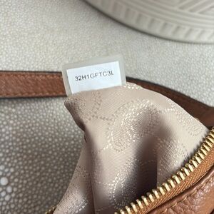 Stylish Michael Kors crossbody bag. Features a tan leather exterior. Gold-tone MK logo accent.
