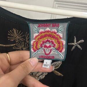 Johnny Was Black Velvet Midi Dress with Gold Floral Embroidery
