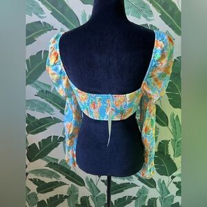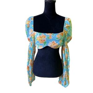 Berksha women’s blue Floral Puff Sleeve Crop Top Long Sleeve Small NWT