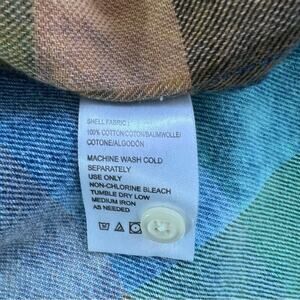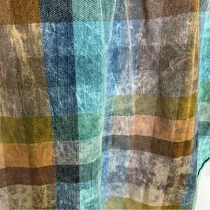 Pretty and feminine blouse, perfect for spring! Great boho style in a cute and cozy top. Tunic silhouette pullover features long sleeves with button cuffs, partial button front placket with ruffle detail. Relaxed tunic fit with shirttail hem. Soft lightweight brushed flannel is done in a plaid print with a cool acid washed effect in cool shades of blue, green, brown, and more. 100% cotton.