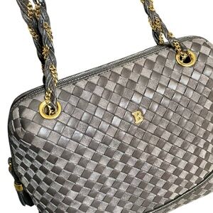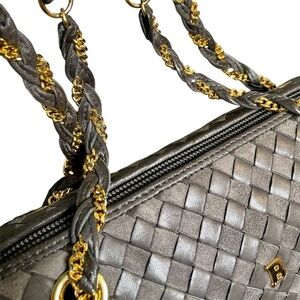 This stunning, timeless intrecchiato shoulder bag from classic luxury brand Bally is in gorgeous vintage condition and needs to be shown off! With ultra soft, warm gray woven leather & suede on the exterior, the full zip top opens to a supple black leather interior with a zippered pocket to keep smaller items close at hand. The tassel zipper pull is constructed of matching leather with gold bead accent, drawing the eye upward to intricately braided leather & gold chain shoulder straps, easily removed via the toggle & grommet for safe storage, or if you want to mix it up every once in a while!