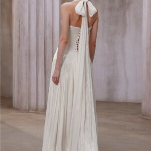 Worn once and dry cleaned. Wore it for my city hall wedding. Fits great, amazing heavy flowing material and very flattering. I’m 5’3 and wore 3 inch heels. Zero damages!