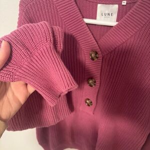 Chunky and cozy knit with button accents. Perfect for layering, wearing with a skirt, wearing around the house, or with jeans! The sweater is in like new condition and was only worn a few times!