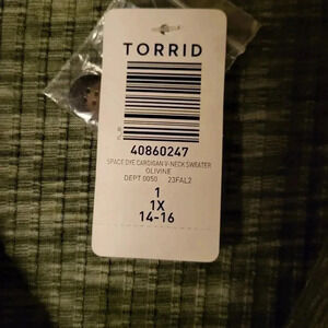 "Stay cozy, stay fabulous with this green Torrid Space Dye Cardigan V-Neck Sweater. This size 1X versatile sweater is perfect for layering and adding a pop of color to your outfit. The V-neck design is flattering and the space dye pattern adds a modern touch. Made with a soft and comfortable fabric, this sweater is perfect for everyday wear.