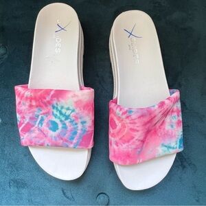 With every step comes comfort and style when you're wearing J/Slides Brit slip-on platform sandals! Textile upper and lining. Tie-dye inspired design on vamp.