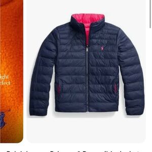 Vibrant fuchsia and navy reversible girls puffer jacket. So versatile. Size 6 and in good condition. Classic Polo logo on both pink and navy side of jacket as well as Polo on zipper closure. Cute, warm, stylish and comfortable for the colder seasons.