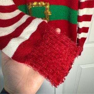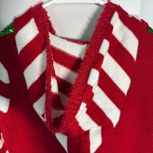 It’s Our Time ugly Christmas sweater, size Medium. Elf-themed tunic sweater features red and white striped sleeves, green sequins, and a hood. Sweater is in good pre-owned condition with minor pilling.