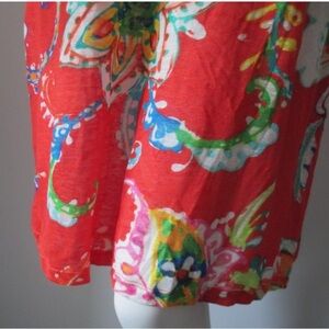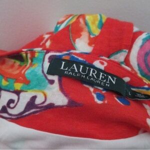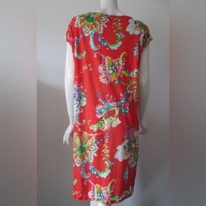 This Ralph Lauren dress features a vibrant red hue with a striking floral and butterfly print, perfect for casual resort wear. Designed with a crew neck and short sleeves, this sheath-style midi dress offers a comfortable and stylish fit. The lightweight fabric ensures breathability, making it ideal for warm weather outings. Pit to pit 20 Dress length 34 B#0