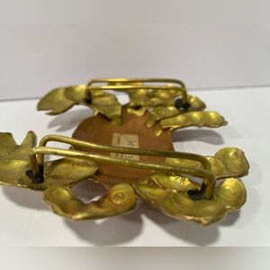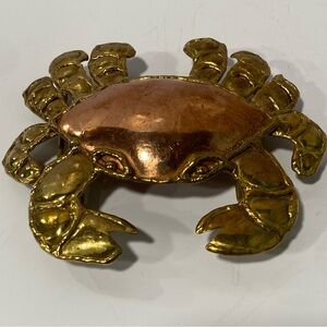 Brass and copper crab belt buckle. Has some wear near eyes, please see photo. A real artsy, statement piece. Measures about 4.25” across and about 3.5” tall. See back for how to attach your own belt or scarf.