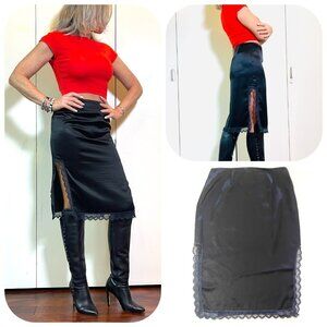 O so sexy! $250 St.Vincent satin lace detail black vintage pencil skirt size 2. Excelkent condition. Zip on the side. Made in USA. Waist 14", length 25". Please, inspect the pictures for condition, as a part of description! Ask questions! Smock and pets FREE home! Check out my other listings to bundle & save!