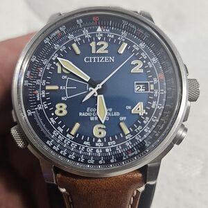 The Citizen Eco-Drive Blue Angels World Chronograph A-T is a radio-controlled perpetual calendar chronograph world timer with atomic timekeeping in 5 time zones and automatic time in 26 world cities. Functions also include a 1/20 second chronograph that measures up to 60 minutes, perpetual calendar, 12/24 hour time, day-date, alarm and power reserve indicator. This men's watch in stainless steel with blue ion plated bezel features an intricate blue and yellow dial, non-reflective sapphire crystal, and a patterned blue leather strap with buckle revealing yellow on its reverse. This Blue Angels official insignia appears on the case back of this 200m water-resistant watch. Citizen Eco-Drive is fueled by light, any light, so it never needs a battery. The use of the Blue Angels name and logo is with the permission, but not endorsement, of the U.S. Navy