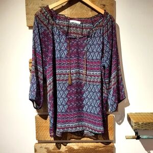 Embrace a bohemian vibe with this stylish blue and pink top. Perfect for casual outings, it features a relaxed fit and intricate patterns. A must-have addition to your wardrobe.