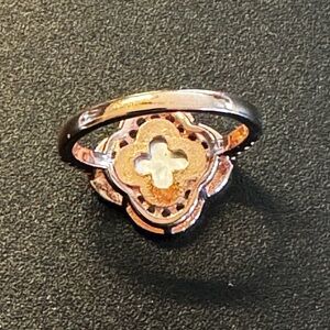 Beautiful NEW four leaf clover ring by jeweler Maya Caroleena Fine Jewelry with a mother of pearl face surrounded by sparkling flaming hearts and arrows cut stones to replicate diamonds. High end jewelry without high end cost. Set in sterling silver covered.925 silver and coated with rose gold.