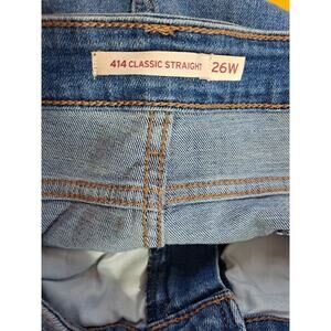 Levi's Women's Blue 414 Classic Straight Stretch Jeans Size 26W Size: 26 M Waist Laid Flat: 23 Inseam:32 Rise:12 Leg: 9 1/2 ● Timeless straight-leg silhouette for versatile styling ● Crafted with mid-stretch denim for comfort and flexibility ● Water<Less® technology for sustainable production ● Zip fly closure for a secure fit ● Easy-care: wash and dry inside out with liquid detergent ● Imported craftsmanship ensures high-quality standards Please let me know if you need any exact measurements If you have any questions at all please DM me