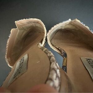 These ladies snakeskin patterned Steve Madden pointed slip on, flat mules, are a size 8.5 and are in good preowned condition. Please see photos as they are part of the description and show the wear and condition of the shoes. Questions? Leave a comment below!
