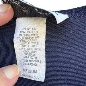 This stylish top offers a flattering fit with 3/4 sleeves and a unique blue geometric pattern. Made with a durable nylon-spandex blend.