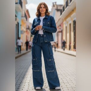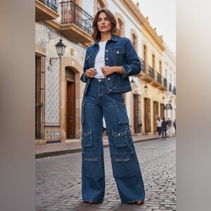 Trendy denim wide-leg cargo jeans. Features multiple pockets for a chic look. Perfect for casual outings.( jeans only)