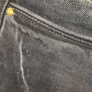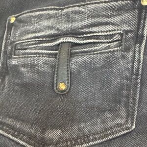 Sleek dark denim jeans with classic design. Features subtle stitching and button details. Ideal for casual wear.