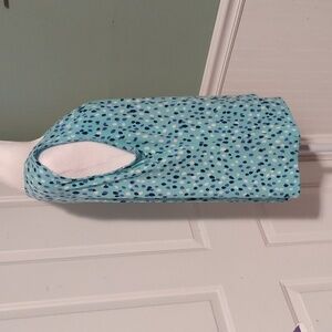 Teal background with white, purple, and dark navy or black dots. Perfect for a layered look for work.