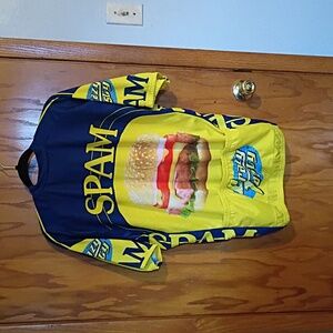 Bold cycling jersey featuring SPAM and Crazy Tasty graphics. Eye-catching yellow and blue design with a burger print.