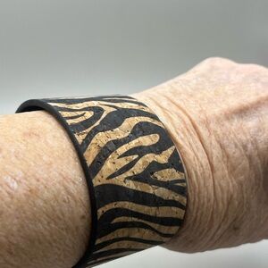 Elevate your style with this unique cork bracelet, featuring a striking black and tan zebra print design. Made from high-quality, eco-friendly cork, this cuff is both stylish and sustainable. The textured pattern adds a touch of wild sophistication to any outfit. Perfect for bohemian chic or everyday wear, this bracelet is sure to turn heads. Pair it with your favorite outfit for a statement look that's both earthy and elegant.item 866