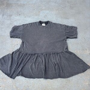Casual gray dress with a relaxed fit. Features a round neckline and short sleeves. Flared hem adds a stylish touch.