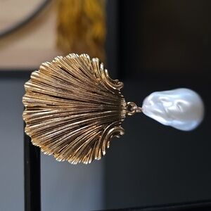 Metal drop earrings with pearl and shell appliqués. Butterfly closure.