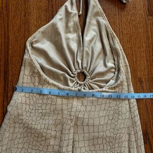 Chic and shimmering gold fabric halter keyhole backless dress. Ideal for stylish occasions. Size 11/12