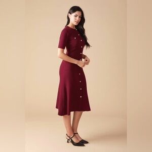 This chic burgundy knit midi dress blends elegance and comfort with its soft sweater-knit fabric and classic silhouette. Designed with a decorative button-down detail, round neckline, short sleeves, and a flattering A-line skirt, it creates a timeless and feminine look perfect for any season.