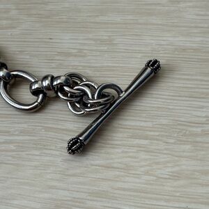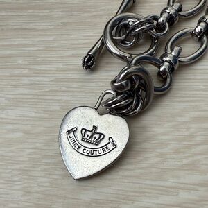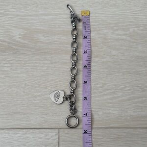 Elegant silver bracelet with a heart charm. Features toggle clasp. Stylish and chic.