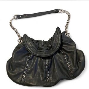 This stylish Kardashian Lollection black bag features chic chain embellishments, perfect for any occasion. Its elegant design makes it a versatile accessory for your wardrobe.
