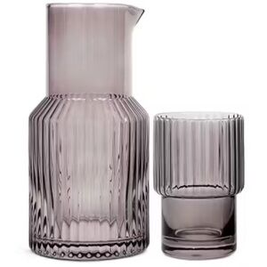 Stylish ribbed glass pitcher and tumbler set in a subtle purple hue. Perfect for serving beverages with elegance.