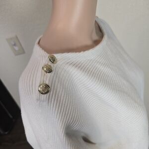 This elegant white sweater features stylish gold button accents on the shoulders. Perfect for a chic and sophisticated look.