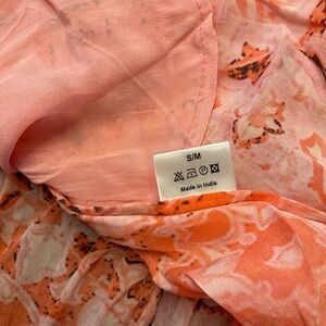 Shahida Parides hi-lo maxi dress in orange & pink floral. Embrace elegance with this bohemian high low dress in a vibrant orange hue. Perfect for any occasion, it features intricate embellishments and a flattering silhouette. Dress has small clasp in front deep v for closure & small loops on inside shoulders for bra or tank straps. Super cute on & all beadwork is attached. Smoke free home.