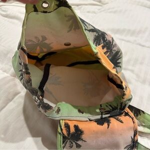 Stylish tote with palm tree design. Features green, orange, and black colors. Ideal for beach days. Missing drawstring and snap closure.