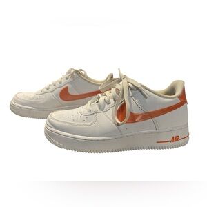 Stylish white sneakers with vibrant orange accents. Perfect for casual wear.